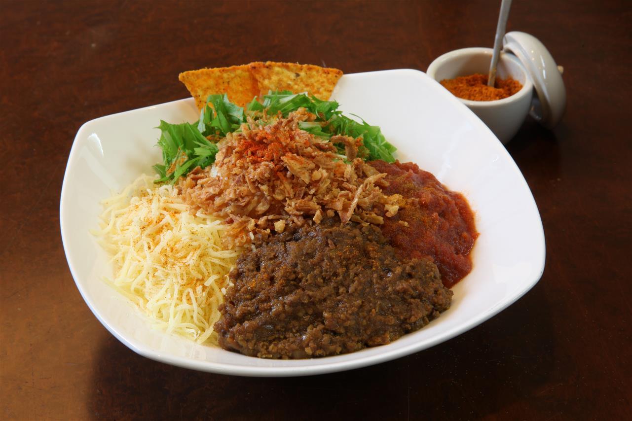 ずしかれーをベースにした辛めのキーマカレーにサルサソース、チーズ、みず菜、おんたまをトッピング。トルティーヤチップスも全て思いっきりかき混ぜてお召し上がりください。