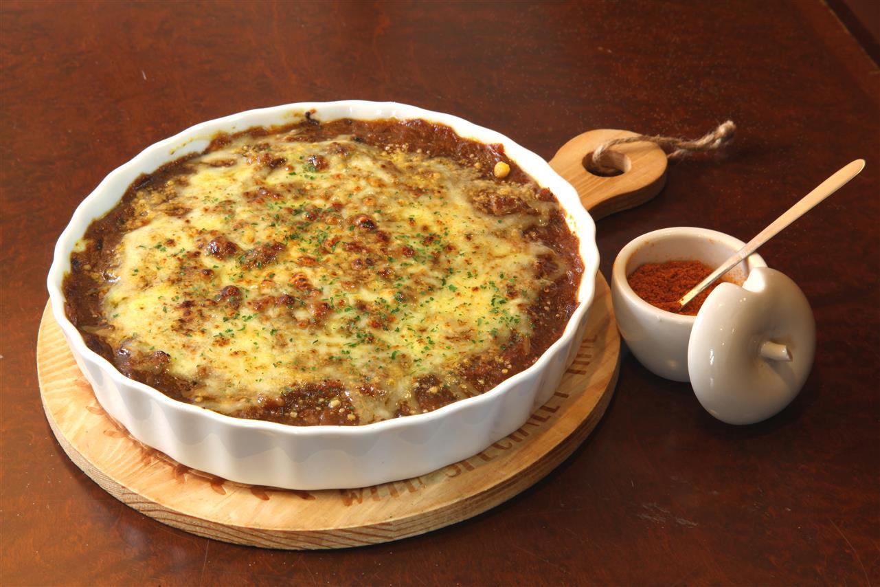 ずしかれーにモッツァレラチーズとホワイトソースを挟んで焼き上げました、当店で一番まろやかなカレー。ご飯は少なめです。