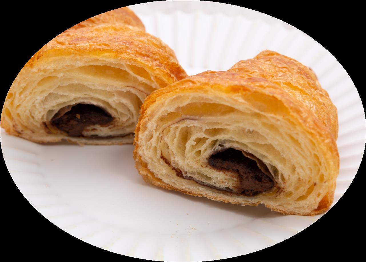 サクサク生地のクロワッサンにドイツ産のチョコレートとヘーゼルナッツの特製フィリングを包み込み焼き上げたお子様にも大人気。アレルギー:小麦、乳、卵、大豆、アーモンド
