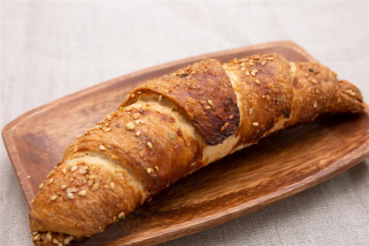 全紘粉をブレンドした生地に亜麻仁、ごま、ひまわりの種、オーツ麦、きび、ケシの実の六穀をトッピングした香ばしいクロワッサンです。アレルギー:小麦、乳、卵、ごま